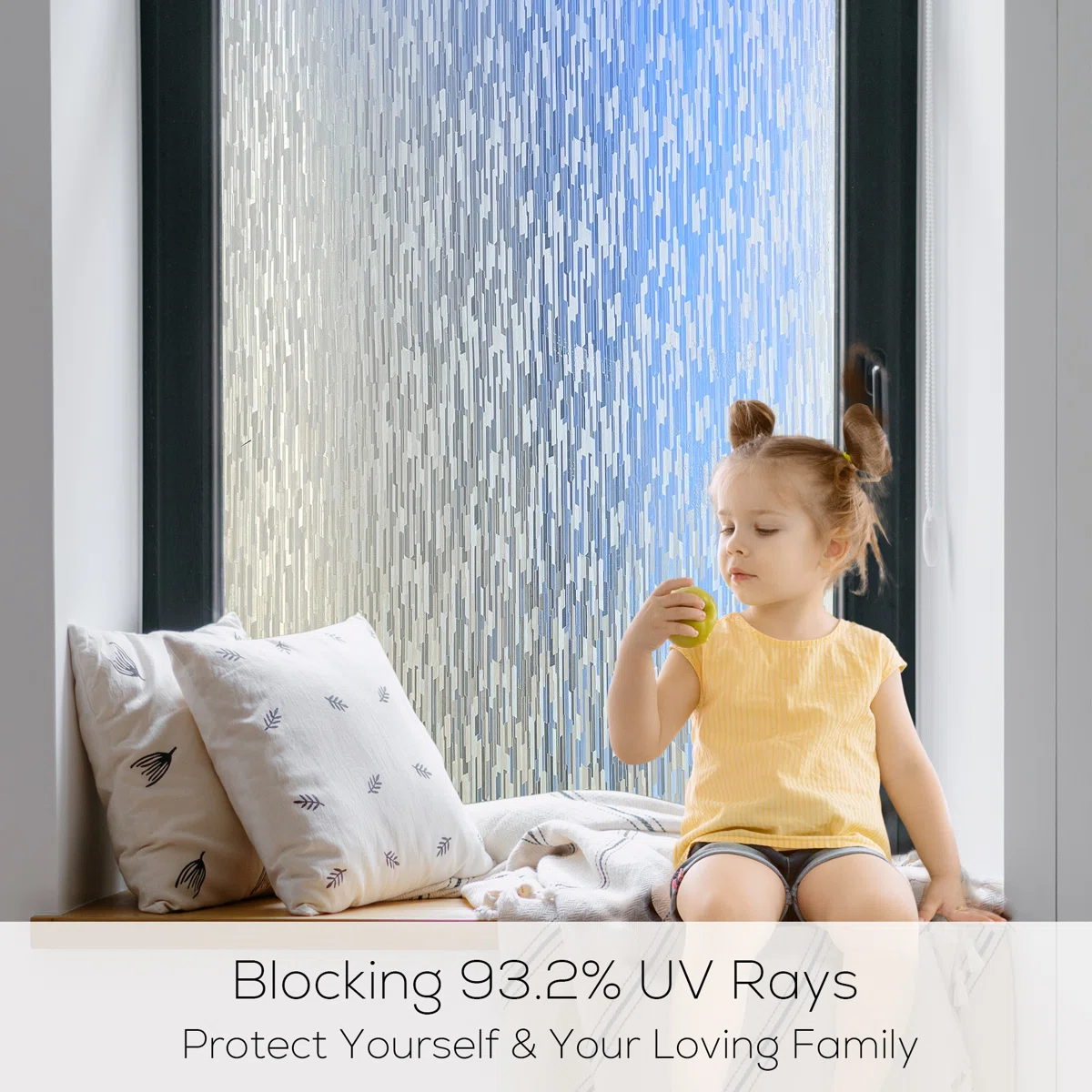 This window decal is the perfect solution for allowing natural light to filter through while maintaining your privacy. It features a rain line pattern that adds a stylish aesthetic into any space it graces, and the delicate etched design will turn the interior scene into blurred shadows to block the prying eyes. This film uses static cling technology, which eliminates the need for adhesive glue during installation, leaving no sticky residue on the glass surface when removed. This film also offers a 93.2% UV blocking rate and 69.1% infrared blocking, shielding your precious skin and beloved furniture from the relentless assault of harmful UV rays. Ideal for living room, bedroom, kitchen, office windows decor, sliding glass doors, glass cabinet panels and so on. *INSTALLATION TIPS: Before installation, please totally clean the window surface and corners to ensure that there is no dust on it. Remember to remove the protective liner before applying and spray plenty of water onto the glass surface and static cling side of the window film for adhesion(the more water, the better). After installation, please trim the edges and leave enough gap between the edge of the film and the window to easily squeeze out the air bubbles.*